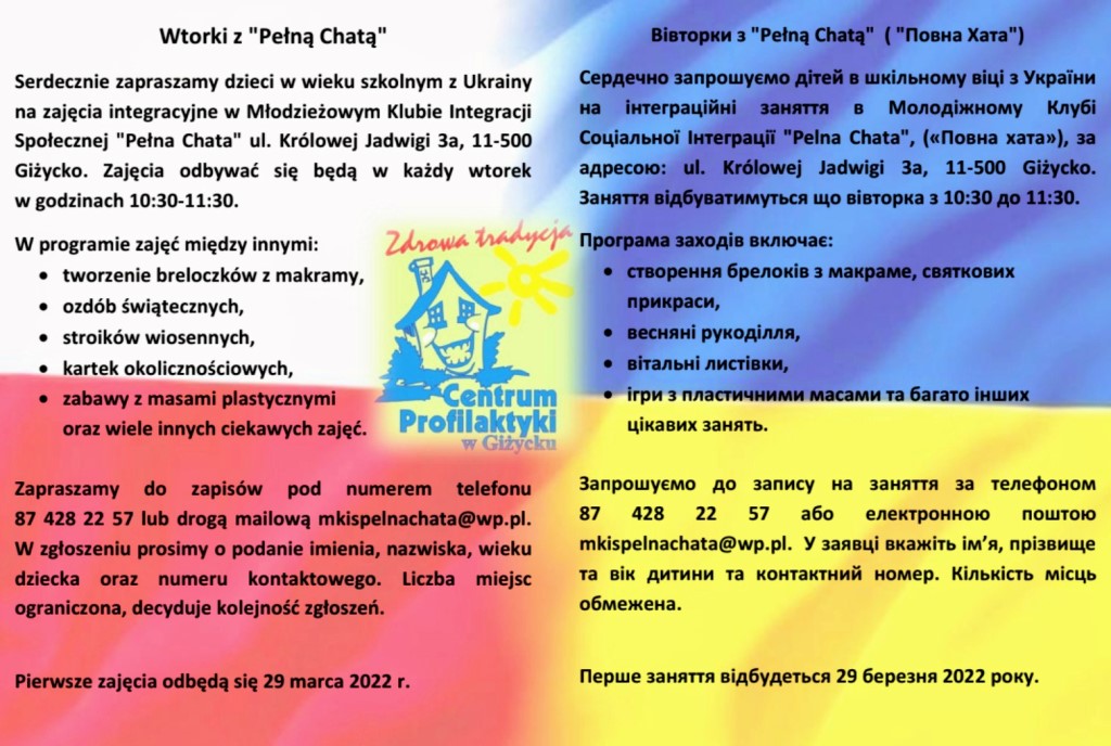 Сердечно запрошуємо дітей в шкільному віці з України на інтеграційні заняття в Молодіжному Клубі Соціальної Інтеграції „Pelna Chata”, («Повна хата»), за адресою: ul. Królowej Jadwigi 3a, 11-500 Giżycko. Заняття відбуватимуться що вівторка з 10:30 до 11:30.