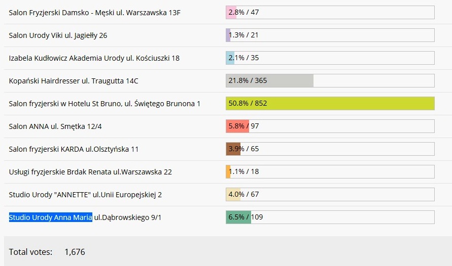 Wiemy kto strzyże najlepiej w Giżycku! Przez 2 tygodnie Czytelnicy, internauci głosowali na najlepszego fryzjera w naszym mieście. Pierwsze miejsce w plebiscycie zajął Salon fryzjerski w Hotelu St. Bruno, na który oddano 852 głosy. Na drugim miejscu uplasował się salon Kopański Hairdresser zdobywając 365 głosów. Trzecie miejsce należy do Studio Urody Anna Maria – 109 głosów. Łącznie oddaliście 1676 głosów!