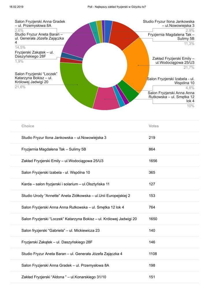 W naszej zabawie chcieliśmy wyłonić zakłady fryzjerskie, które cieszą się dużym uznaniem wśród klientów. Łącznie zgłoszonych zostało 14 zakładów fryzjerskich. Podczas głosowania internauci oddali 7627 głosów.