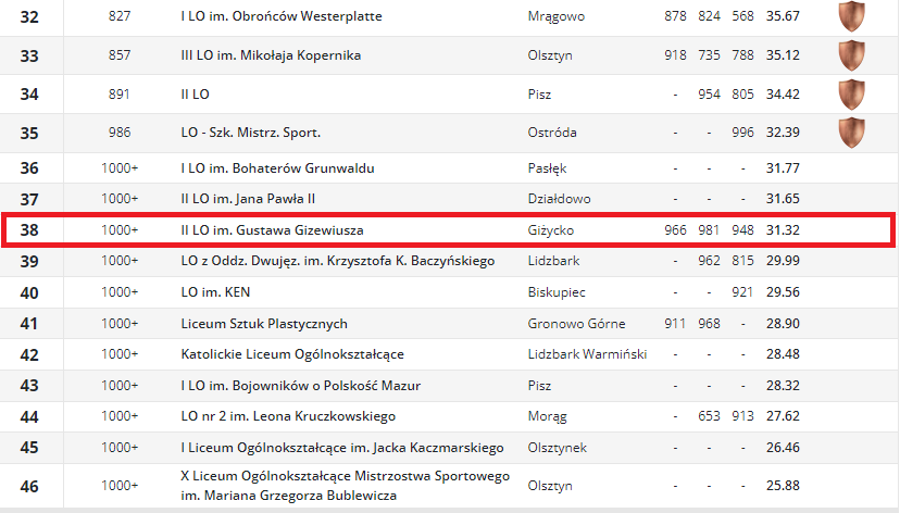 Niestety żadne z giżyckich techników nie zakwalifikowało się do rankingu głównego obejmującego 500 najlepszych szkół. W rankingu wojewódzkim 23 miejsce zajęło Technikum nr 2 (ZSEiI) i 48 miejsce Technikum nr 1 (ZSKŚiA).