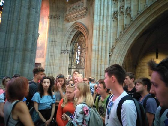 Na spacer uliczkami Pragi zaprosiła nas p. Danuta Peszkova – rodowita Wydminianka, która poprowadziła nas po stolicy Czech „swoimi” ścieżkami. Naszą wędrówkę rozpoczęliśmy na dziedzińcu Zamku na Hradczanach, zajrzeliśmy do Katedry św. Wita, Wacława i Wojciecha, gdzie podziwialiśmy między innymi przepiękne witraże. Przechodząc Mostem Karola, każdy obowiązkowo zatrzymał się przy figurce Św. Jana Nepomucena. Na Malej Stranie podziwialiśmy Pałac i Ogrody Waldsteina oraz ciekawa ścianę naciekową. Niestety nie udało nam się zobaczyć w pełnej okazałości słynnego Zegara Astronomicznego, bo aktualnie znajduje się w remoncie. Musieliśmy zadowolić się wyświetlaną aplikacją, ale i tak warto było na niego spojrzeć. Podczas pobytu w Pradze mogliśmy również skosztować typowej czeskiej kuchni, niektórzy skusili się na słynne knedliczki czy wyprażany ser.