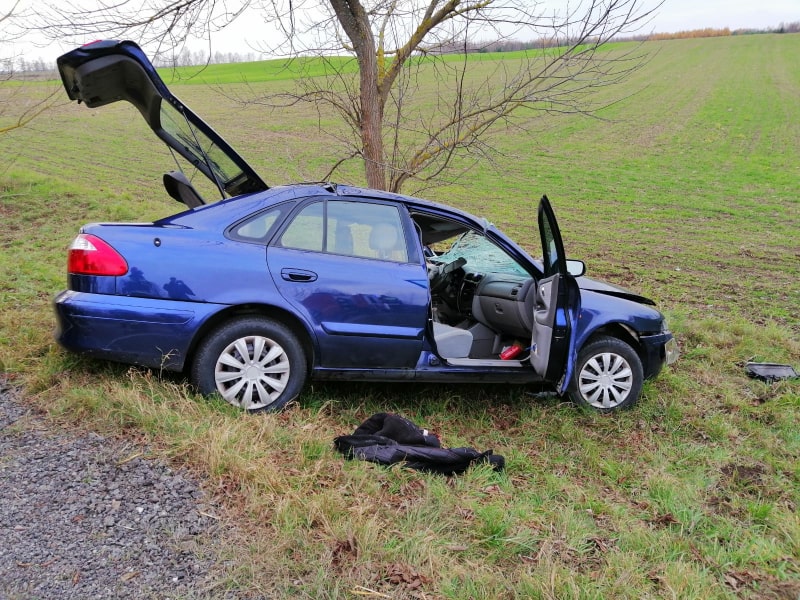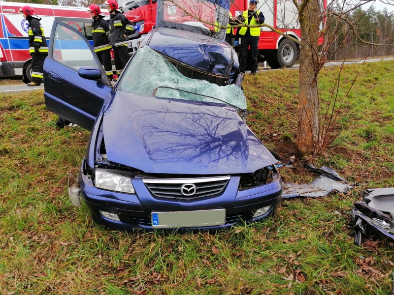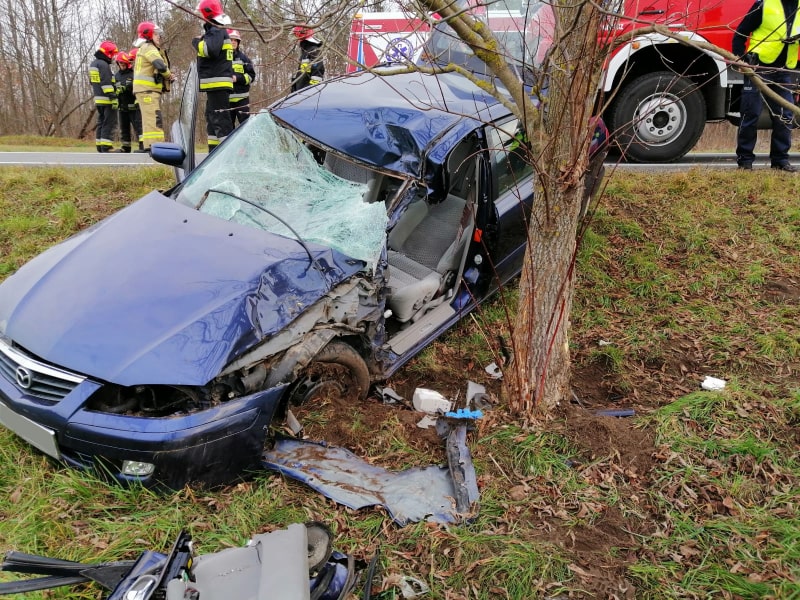 Pojazd z niewyjaśnionych przyczyn zjechał z jezdni i uderzył w przydrożne drzewo. W zdarzeniu brała udział jedna osoba. Działania zastępów straży pożarnej polegały na zabezpieczeniu miejsca zdarzenia, stabilizacji pojazdu, ewakuacji poszkodowanego z pojazdu przy pomocy sprzętu hydraulicznego i przekazaniu Zespołowi Ratownictwa Medycznego.