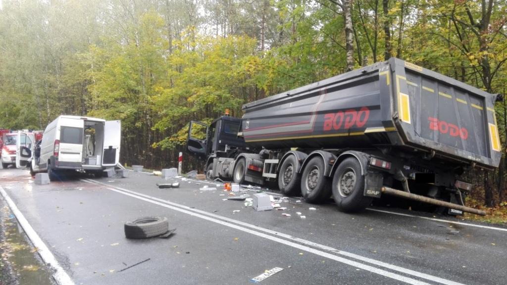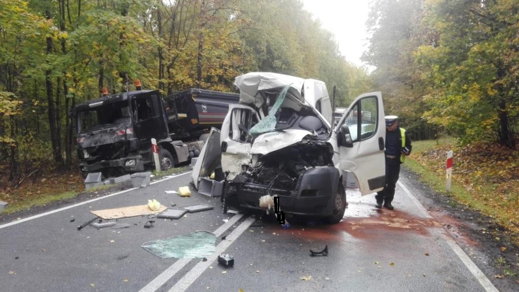 Do zdarzenia doszło wczoraj, 10 października na drodze krajowej nr 59 w miejscowości Wejdyki. Z ustaleń funkcjonariuszy wynika, że kierujący samochodem dostawczym marki Peugeot Boxer nie dostosował prędkości do warunków na drodze w wyniku czego zjechał na przeciwległy pas ruchu i uderzył czołowo w prawidłowo jadący z naprzeciwka samochód ciężarowy markiki Mercedes. W wyniku zdarzenia dwóch kierowców zostało przetransportowanych do szpitala. Kierowcy byli trzeźwi.