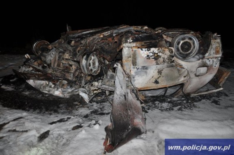Policjanci z Giżycka pracowali na miejscu wypadku drogowego, do którego doszło w miejscowości Zielony Gaj. 27-latek po tym jak uderzył w drzewo vw golfem wypadł przez przednią szybę, a auto przewróciło się na dach i spłonęło. W wyniku zdarzenia kierowca trafił do szpitala. Jak się okazało, miał blisko 3 promile alkoholu w organizmie i zakaz prowadzenia pojazdów.