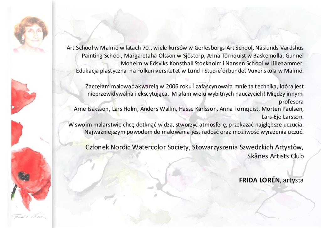 „Zaczęłam malować akwarelą w 2006 roku i zafascynowała mnie ta technika, która jest nieprzewidywalna i ekscytująca. Miałam wielu wybitnych nauczycieli! Między innymi profesora Arne Isaksson, Lars Holm, Anders Wallin, Hasse Karlsson, Anna Törnquist, Morten Paulsen, Lars-Eje Larsson. W swoim malarstwie chcę dotknąć widza, stworzyć atmosferę, przekazać najgłębsze uczucia. Najważniejszym powodem do malowania jest radość oraz możliwość wyrażenia uczuć”.