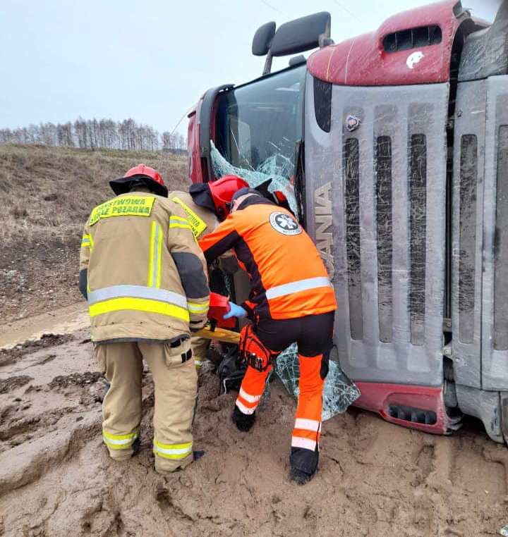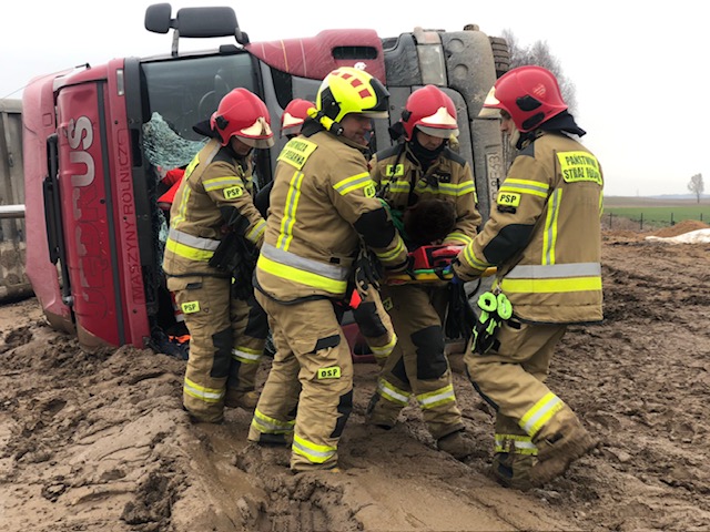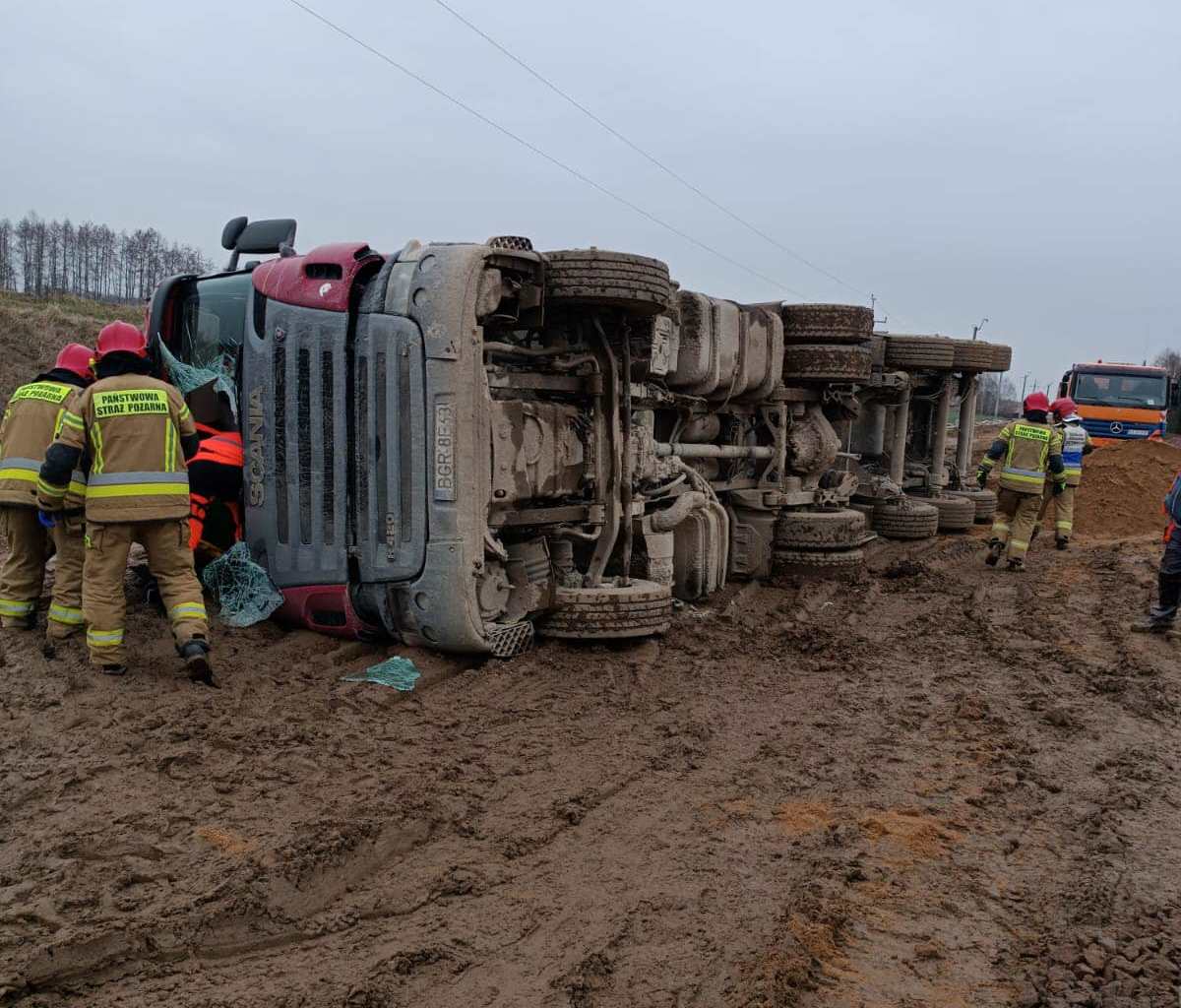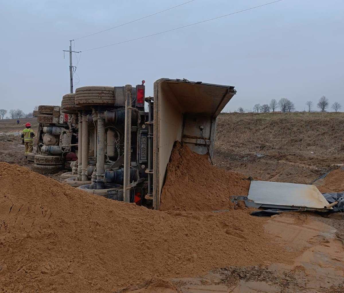 Dokładnie o godzinie 11:44 do służb wpłynęła informacja o ciężarówce, która podczas wysypywania rozładunku przewróciła się na bok.