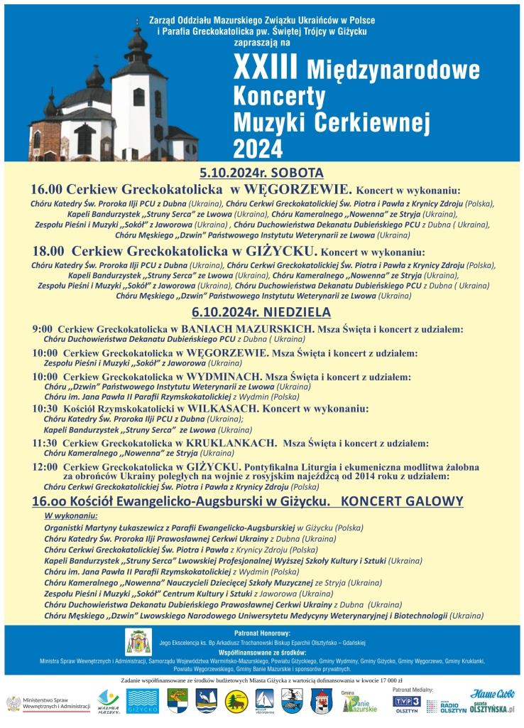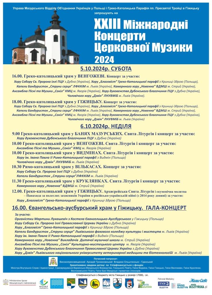 Zarządu Oddziału Mazurskiego Związku Ukraińców w Polsce i Parafia Greckokatolicka p.w. Św. Trójcy w Giżycku zapraszają na ,,XXIII Międzynarodowe Koncerty Muzyki Cerkiewnej 2024” w dniach 05-06 października 2024r.