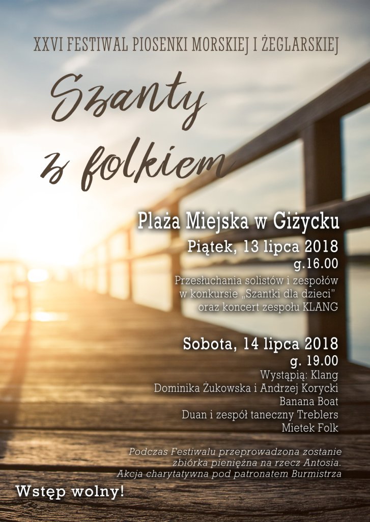 Giżyckie Centrum Kultury zaprasza wszystkich miłośników szant do Giżycka na XXVI Festiwal Piosenki Żeglarskiej i Morskiej „Szanty z Folkiem” 2018.