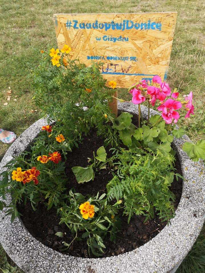 Wybrana donica na parkingu przy ul. Kolejowej była zagospodarowywana dwukrotnie, gdyż niestety pierwsze nasadzenia zostały zniszczone. Niemniej jednak drugie sadzenie się udało i roślinki powoli rosną i są doglądane przez giżyckich seniorów.