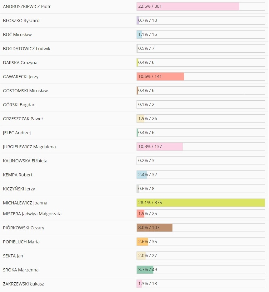 W sumie nasi czytelnicy oddali 1336 głosów. Największą liczbę głosów zdobyła radna Joanna Michalewicz- 375 (28,1 %). Kolejne miejsce zajął radny Piotr Andruszkiewicz zdobywając 301 głosów (22,5 %).