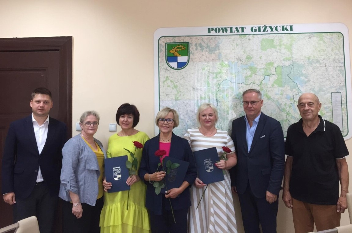 22 sierpnia 2022 r. Starosta Giżycki Mirosław Dariusz Drzażdżewski w obecności Zarządu Powiatu wręczył Uchwały powołujące 3 Panie na stanowiska dyrektorów w szkołach, dla których organem prowadzącym jest Powiat Giżycki.