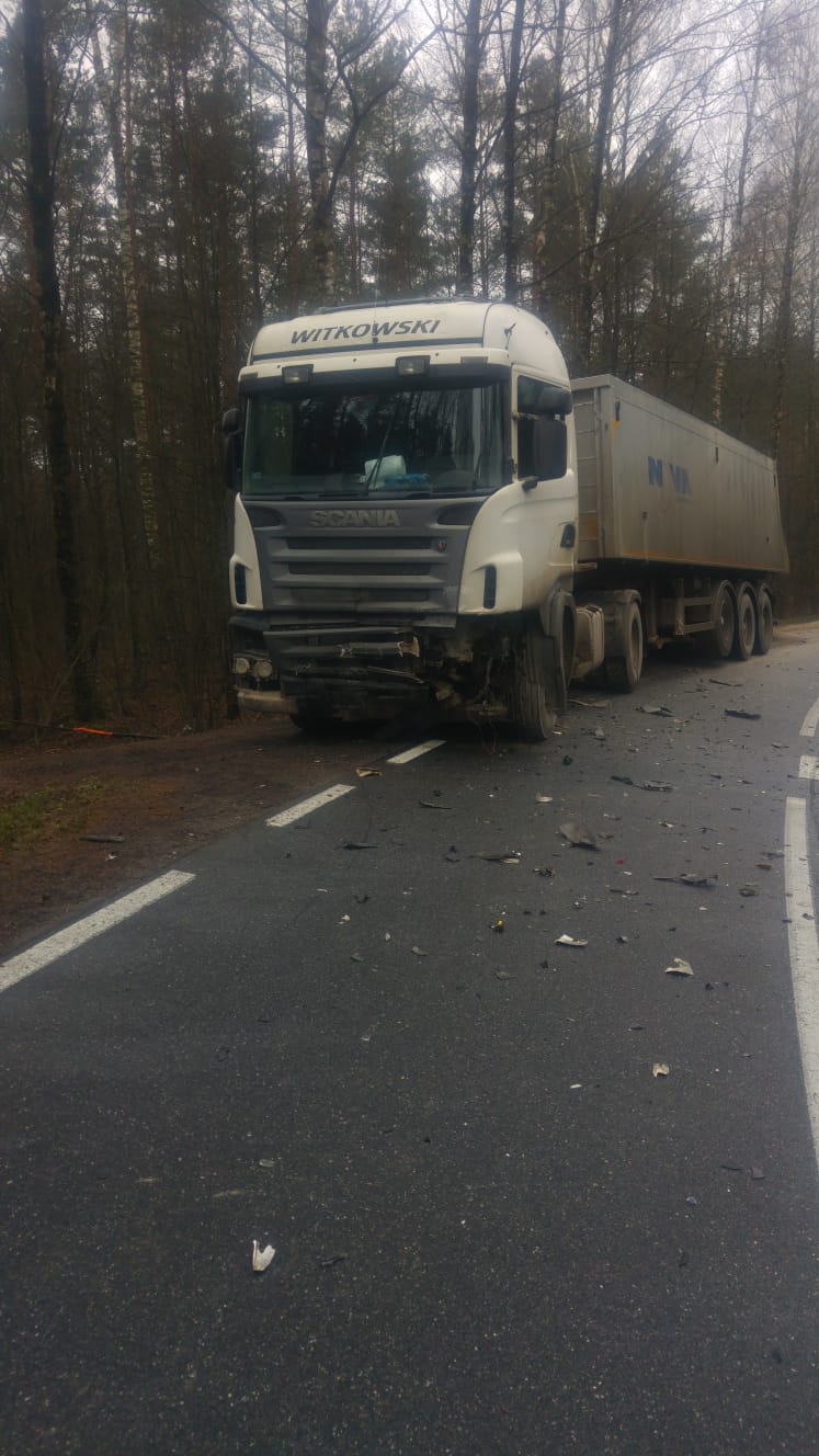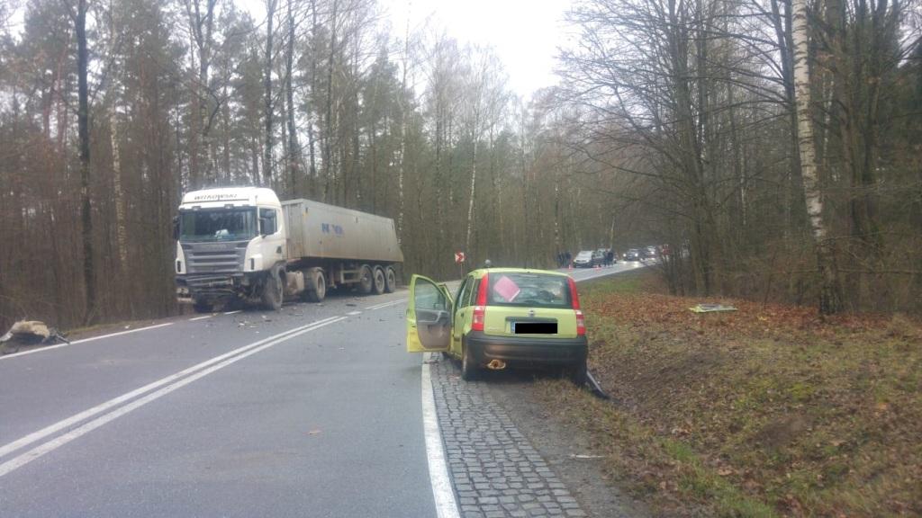 Dzisiaj, 14 grudnia około godziny 12:00 na drodze krajowej nr 59 w m. Wejdyki gm. Ryn doszło do zderzenia osobówki z ciężarówką.