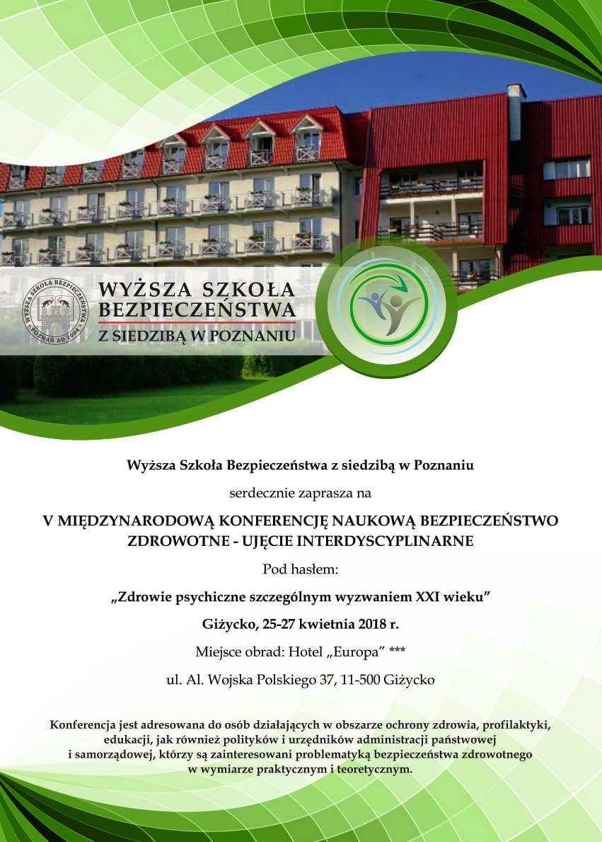„Zdrowie psychiczne szczególnym wyzwaniem XXI wieku”- konferencja naukowa 5 kwietnia 20180Wydział Nauk Społecznych w Giżycku Wyższej Szkoły Bezpieczeństwa z siedzibą w Poznaniu zaprasza na V Międzynarodową Konferencję Naukową „Bezpieczeństwo zdrowotne - ujęcie interdyscyplinarne.