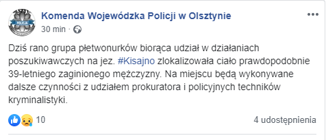 – W wyniku przeprowadzonych dzisiaj z udziałem prokuratora czynności identyfikujących, potwierdzono, iż znaleziono w jeziorze Kisajno ciało mężczyzny, który w dniu 18 sierpnia 2019r. uczestniczył z wypadku, co do którego Prokuratura Rejonowa w Giżycku prowadzi śledztwo z art. 177§2kk. Po przeprowadzeniu oględzin zewnętrznych, na zlecenie Prokuratury zostanie przeprowadzona sekcja zwłok w specjalistycznym Zakładzie Medycyny Sądowej.