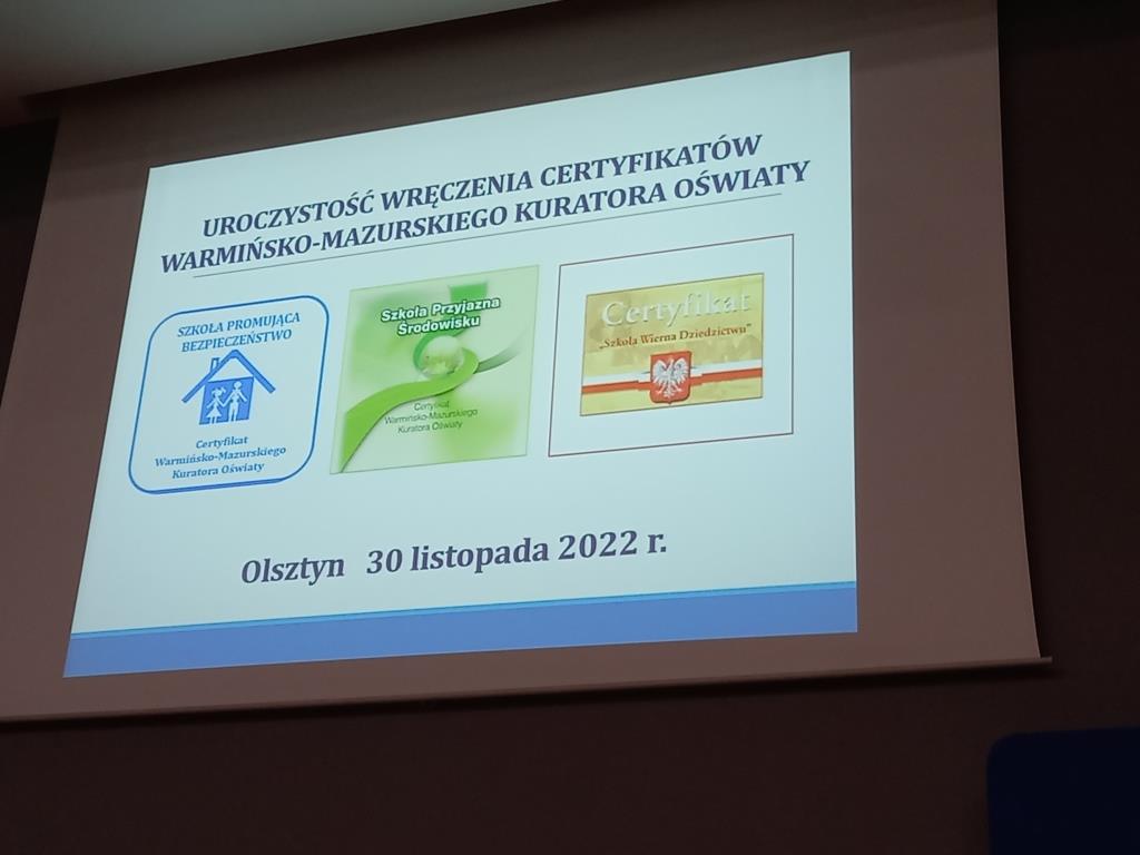 30 listopada 2022 r. w Urzędzie Wojewódzkim w Olsztynie odbyła się uroczystość wręczenia szkołom i placówkom oświatowym wyróżnień Warmińsko-Mazurskiego Kuratora Oświaty w propagowaniu w społeczności szkolnej wiedzy z zakresu ekologii, historii i promowania bezpieczeństwa. Zespół Szkół Kształtowania Środowiska i Agrobiznesu w Giżycku otrzymał dwa Certyfikaty „Szkoła Przyjazna Środowisku” i „Szkoła Wierna Dziedzictwu”. Koordynatorami działań, które przyczyniły się do tego podwójnego sukcesu byli Magdalena Czaus, Halina Czarnecka, Violetta Arian i Andrzej Arian.