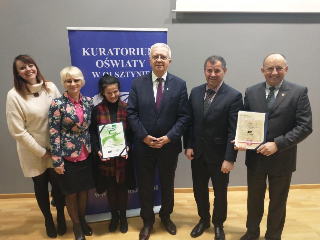 Certyfikaty „Szkoła Przyjazna Środowisku” i „Szkoła Wierna Dziedzictwu” przekazane zostały na ręce wicedyrektora Dariusza Radziulewicza i koordynatorów przez Warmińsko-Mazurskiego Kuratora Oświaty Marka Krzysztofa Nowackiego, który pogratulował wyróżnienia i podziękował za wkład pracy włożony w szerzenie wiedzy w zakresie ekologii oraz historycznej nie tylko wśród młodzieży szkolnej, ale również w środowisku lokalnym.